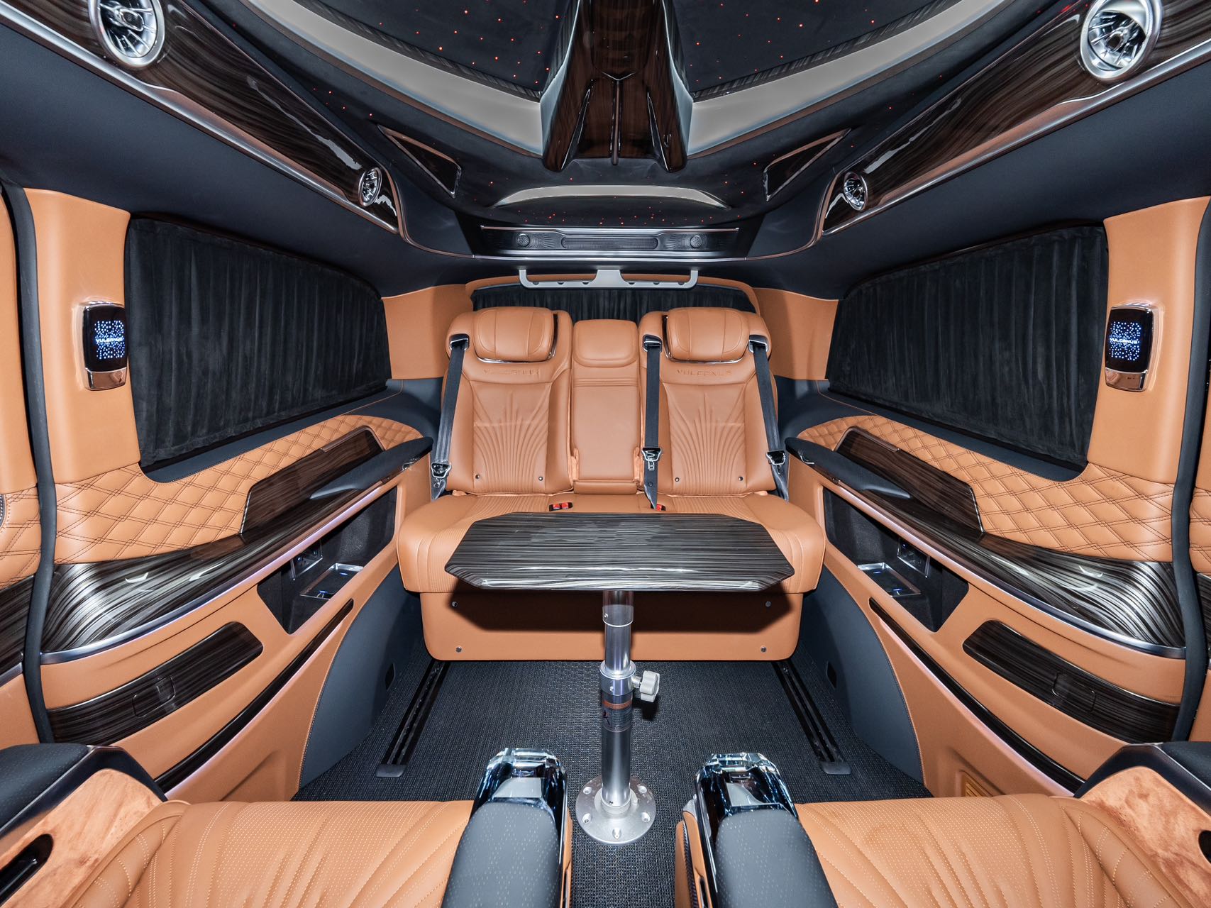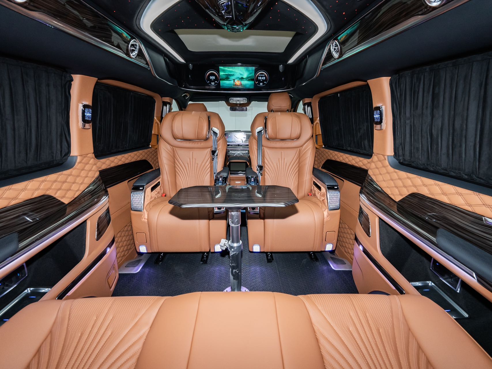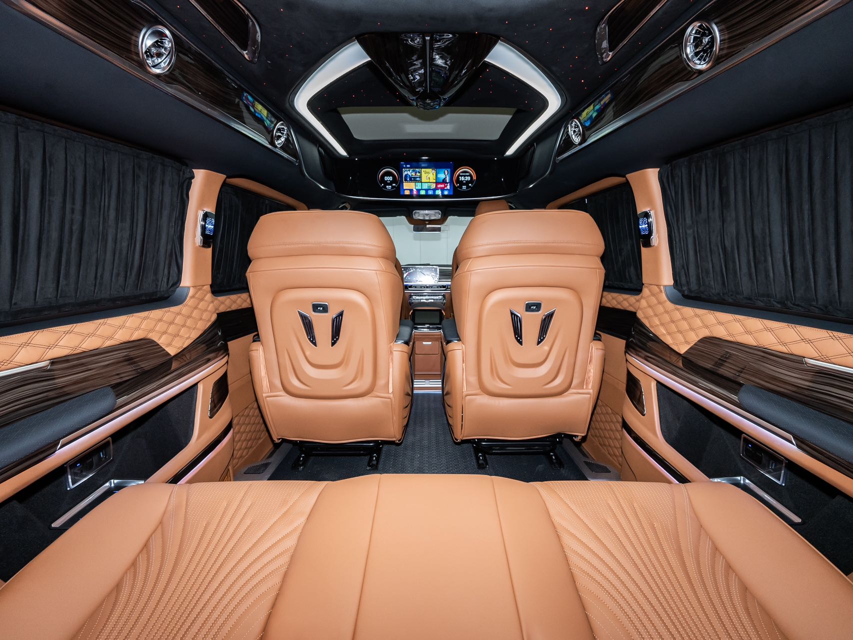 Family-optimized features: The vehicle combines comfort with convenience, featuring a starry ceiling ambiance light that creates a romantic travel atmosphere. A large entertainment screen supports regular movie playback, while the onboard refrigerator stores both baby and parent essentials and keeps champagne chilled. The high-ceiling design accommodates child safety seats and elderly seating, ensuring a comfortable and practical family journey that balances ceremony and functionality.