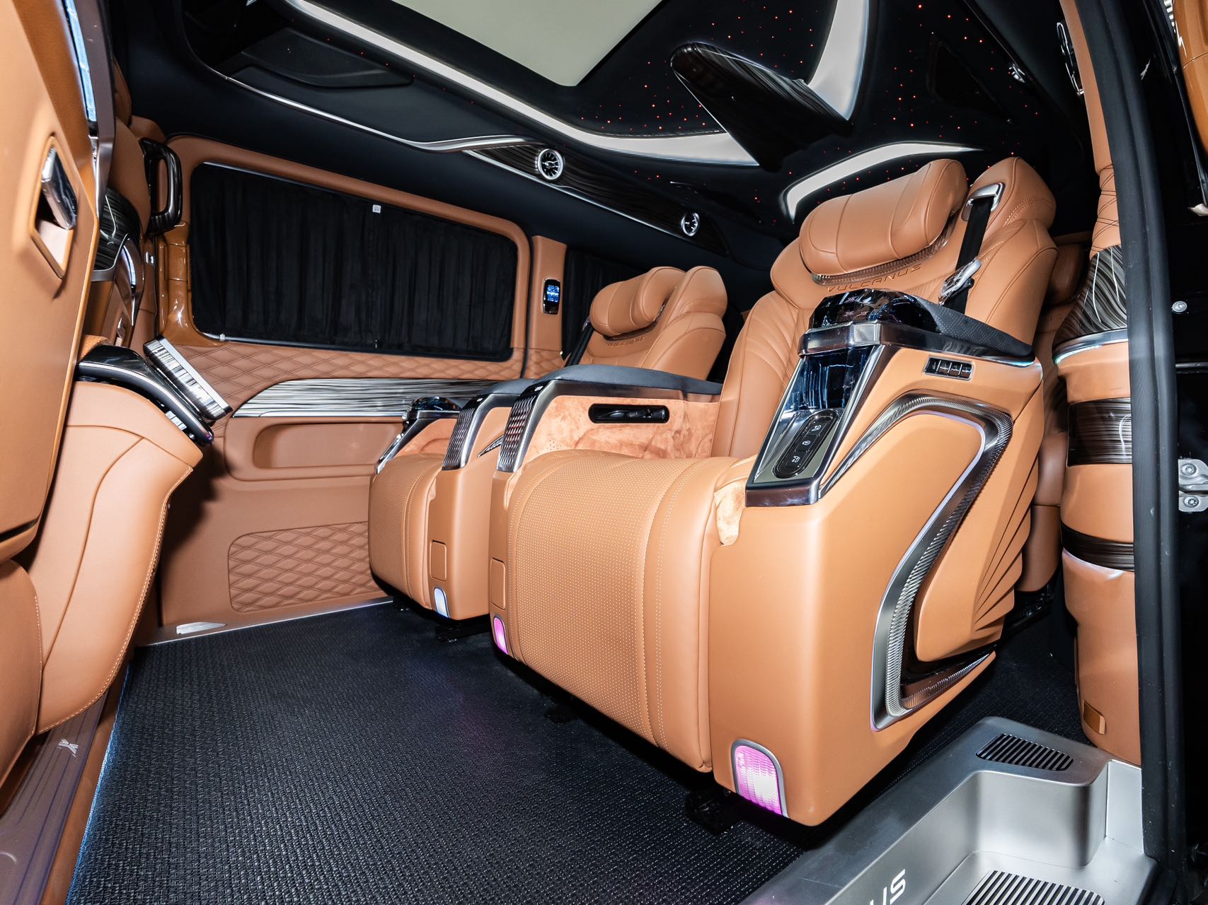 The front fascia features the classic Mercedes-Benz trident emblem, standing intact and proud. The chrome grille, designed with a straight-flowing waterfall effect, is oxidation-free and scratch-free, complemented by a vertically layered chrome trim that seamlessly blends the brand’s authoritative presence with the refined contours of British aristocracy. The all-black body, accentuated by silver chrome accents, boasts an excellent paint finish with no visible scratches or color variations. The dimensions remain unchanged at 5400×1928×2100mm, featuring a high roof design and a 3430mm extended wheelbase, which increases headroom by 170mm compared to the original height. With a 2100mm ground clearance, it still allows easy access to standard garages, balancing both prestige and practicality.