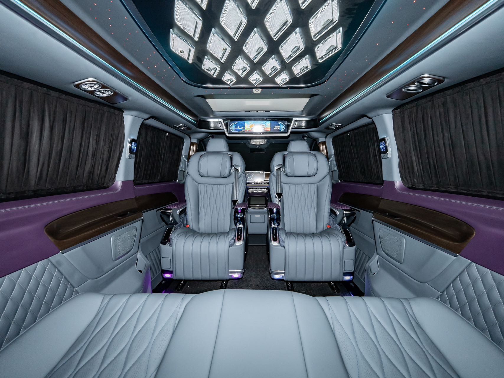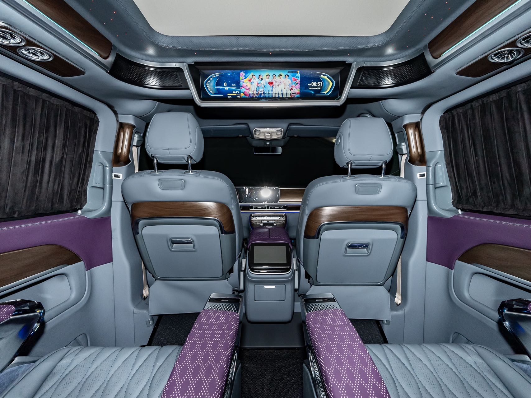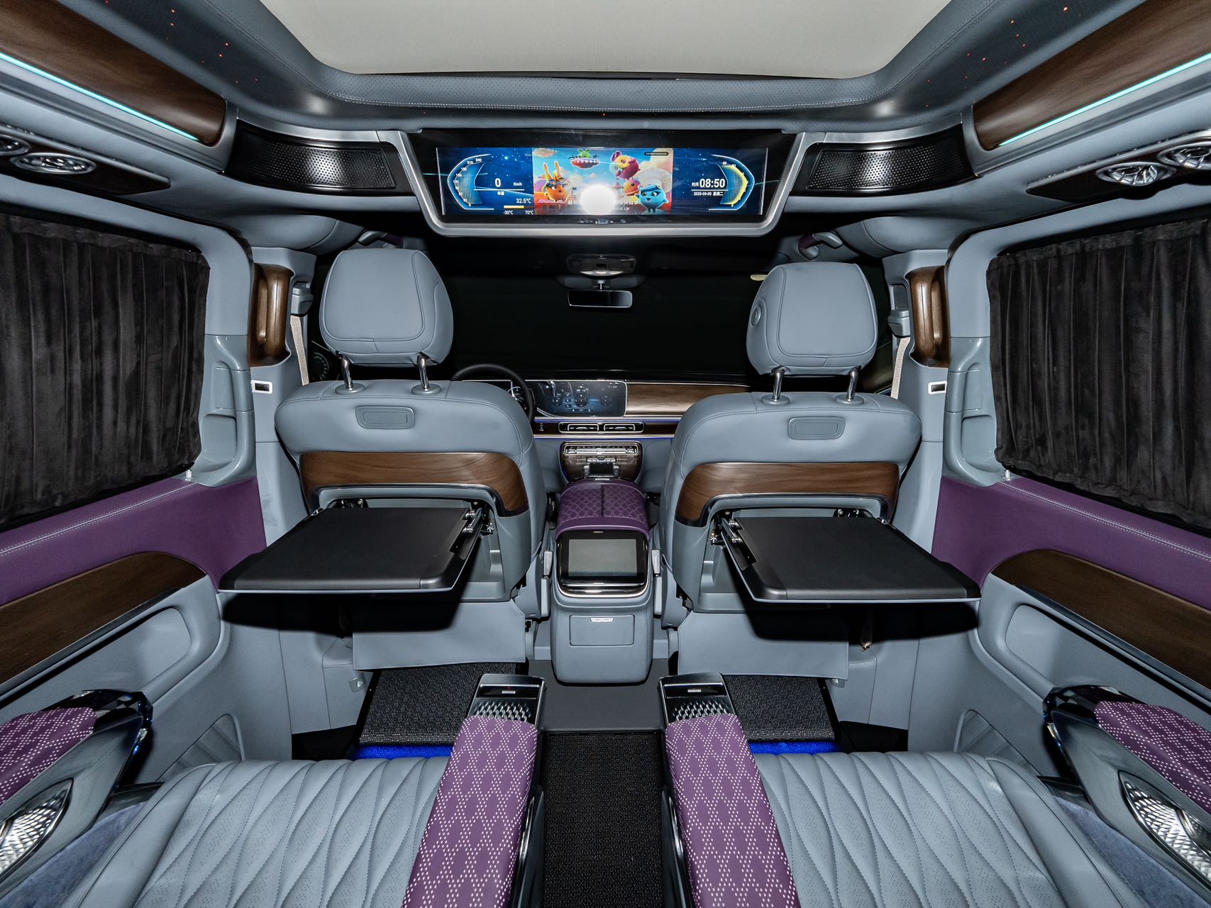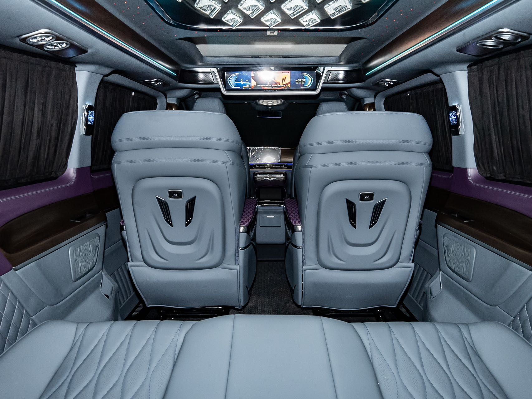 • Aluminum alloy welcome pedals; • Luxury air vents, luxury ceiling lights, ambient lighting; • Second-row seats (Crystal Throne 4.0, heated, ventilated, manually rotated 180 degrees, pneumatic massage, wireless charging); • Third-row seats (Hongyi 5.0 model, center armrest (including touchscreen), V-Class original sliding rails (electric unlocking), electric backrest, fore-and-aft adjustment), storage compartments, drawers, cup holders; • Water transfer printed trim panels (V300 original wood grain); • Safety hammer, first aid kit, fire extinguisher, reflective vest; • Woven flooring; • Driver and passenger seat backrests; • High-end black manual curtains; • Removable small tables |
