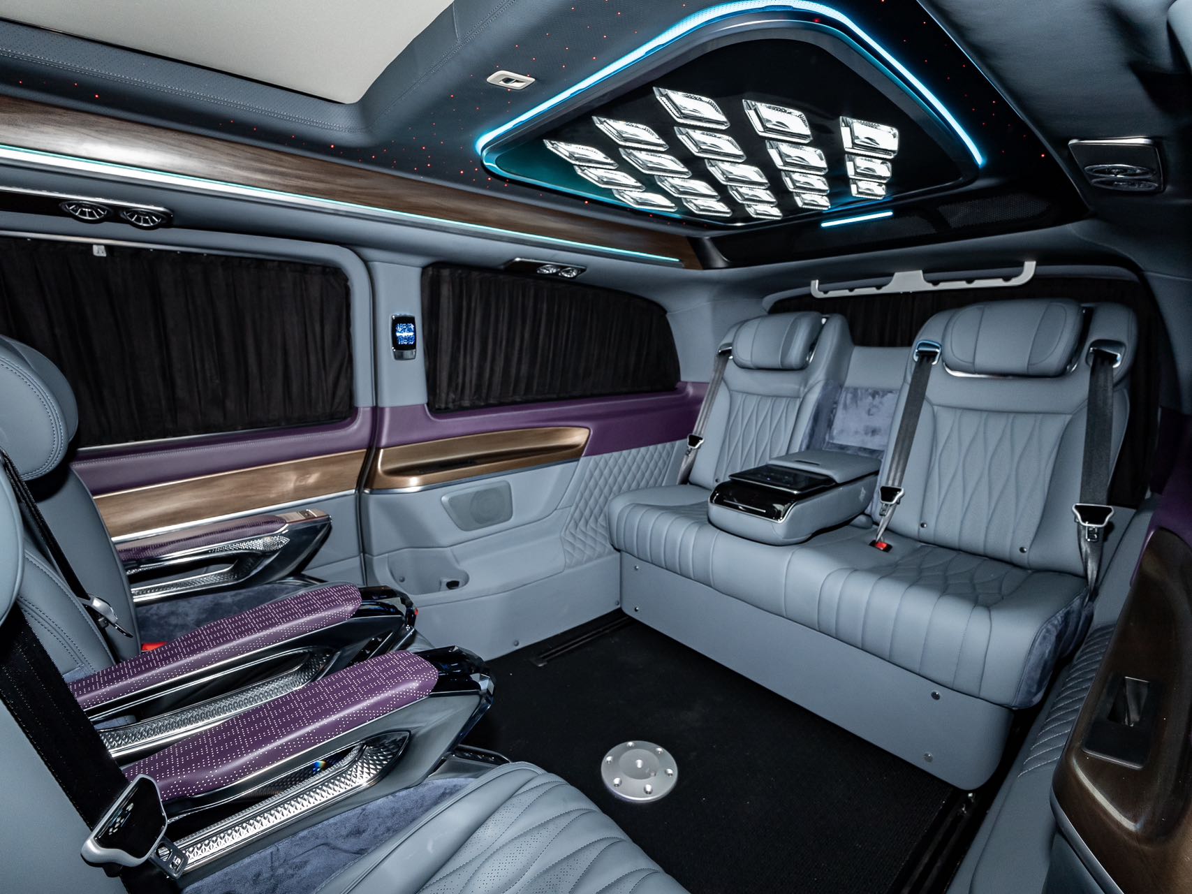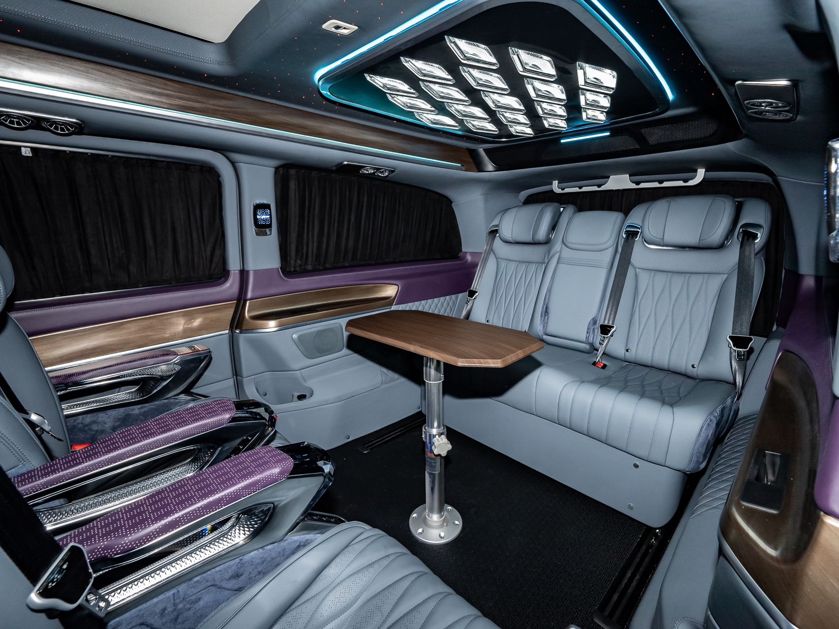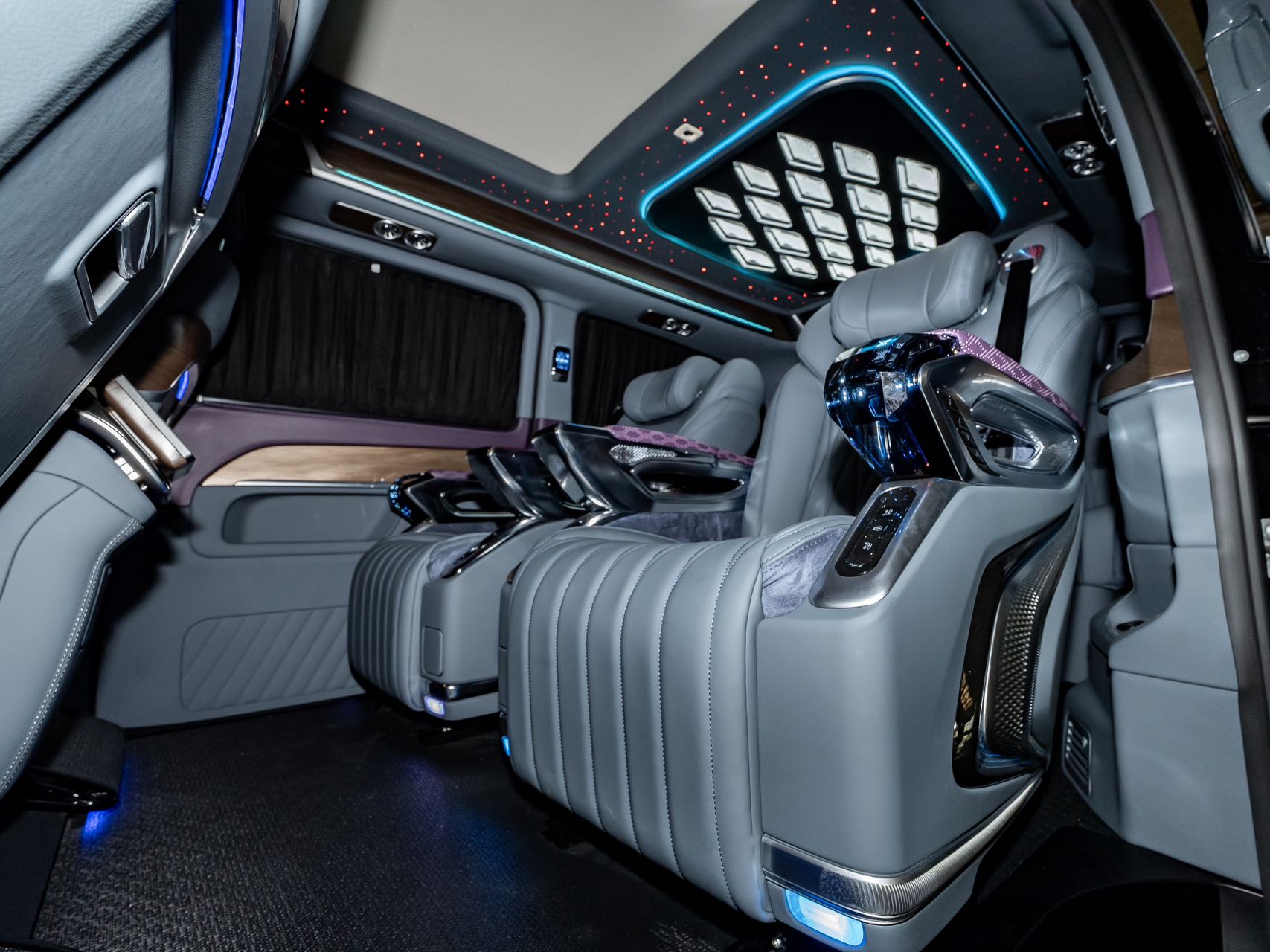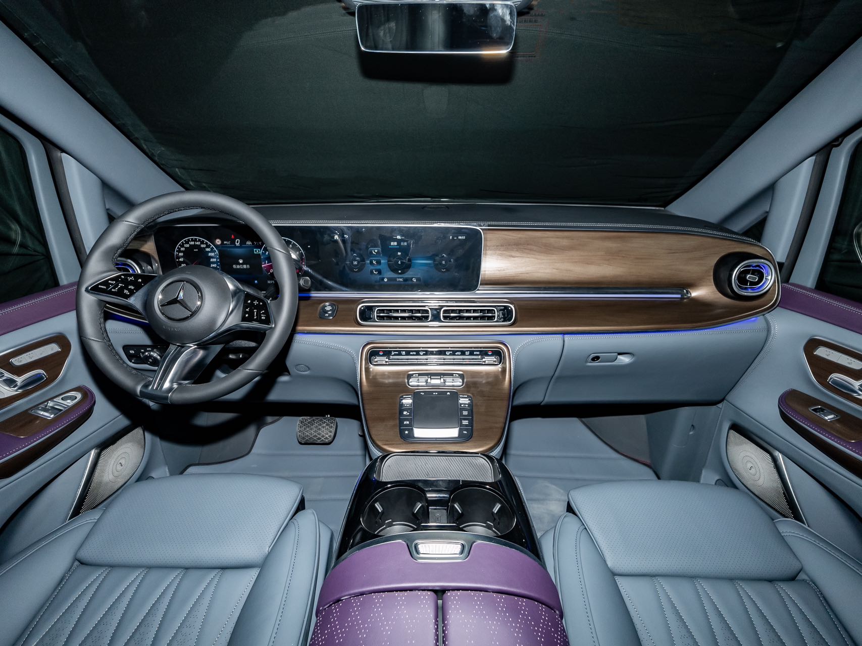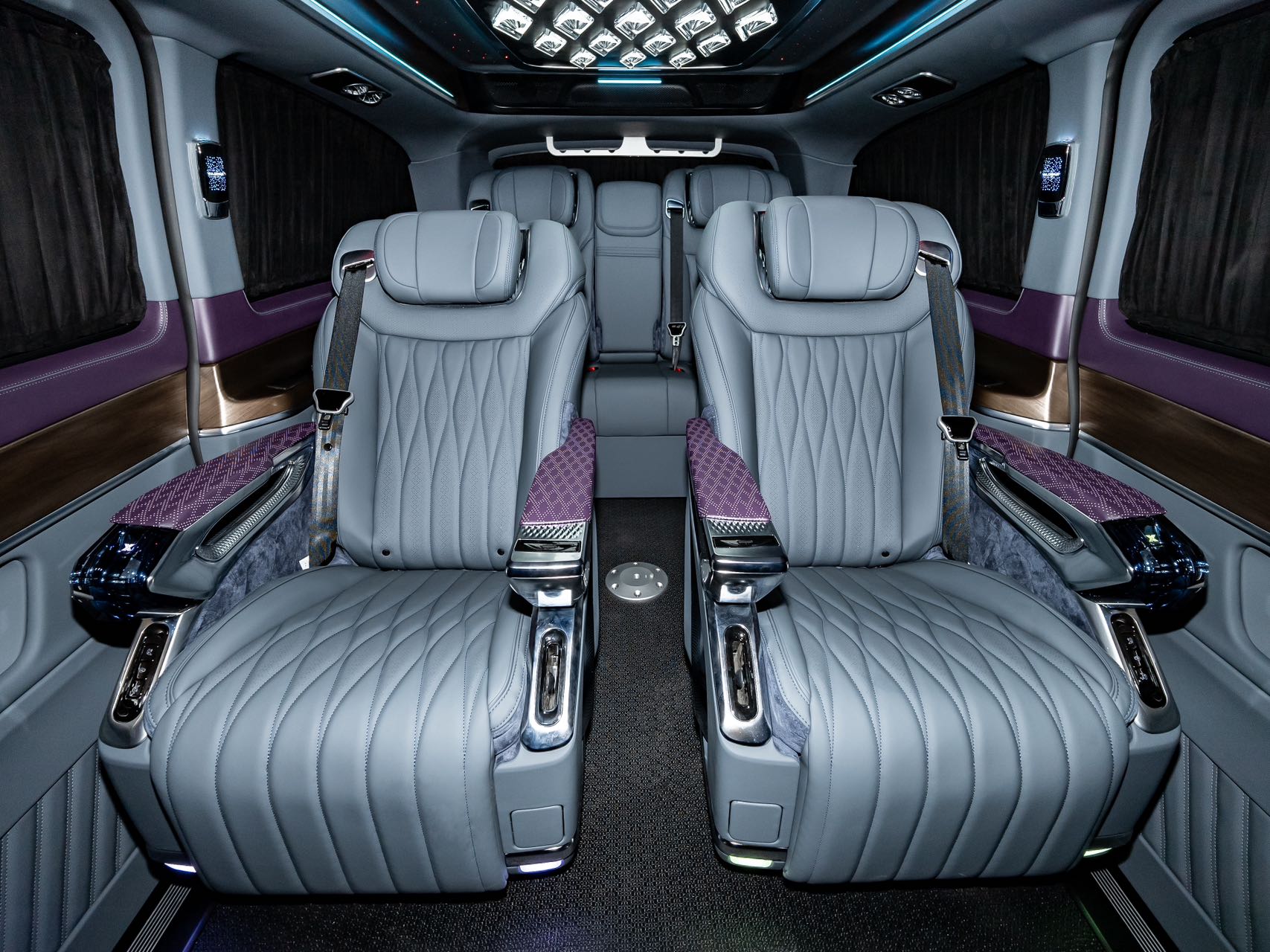 • Aluminum alloy welcome pedals; • Luxury air vents, luxury ceiling lights, ambient lighting; • Second-row seats (Crystal Throne 4.0, heated, ventilated, manually rotated 180 degrees, pneumatic massage, wireless charging); • Third-row seats (Hongyi 5.0 model, center armrest (including touchscreen), V-Class original sliding rails (electric unlocking), electric backrest, fore-and-aft adjustment), storage compartments, drawers, cup holders; • Water transfer printed trim panels (V300 original wood grain); • Safety hammer, first aid kit, fire extinguisher, reflective vest; • Woven flooring; • Driver and passenger seat backrests; • High-end black manual curtains; • Removable small tables |